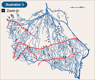 The map on the left shows the main irrigation canals of this area. The canals are like blood vessels in the human body, or arteries. For example, if we zoom in the rectangular zone on the map, we can see that, as shown in Illustration 3, there are even smaller canals spreading out like capillaries or peripheral nerves, each carrying water to every part of Azumino, leaving no area non-irrigated.