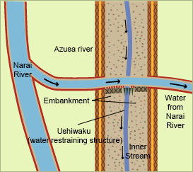 This gradient of water, 1 meter/3 km, is almost within the margin of error: that is, equivalent, for example, to moving the summit of Mount Yarigatake (3,180 meters high) just one meter sideways. Needless to say, it was constructed not by using modern leveling instruments or telescopes, but rather by manual digging alone, using only hoes and rope baskets.