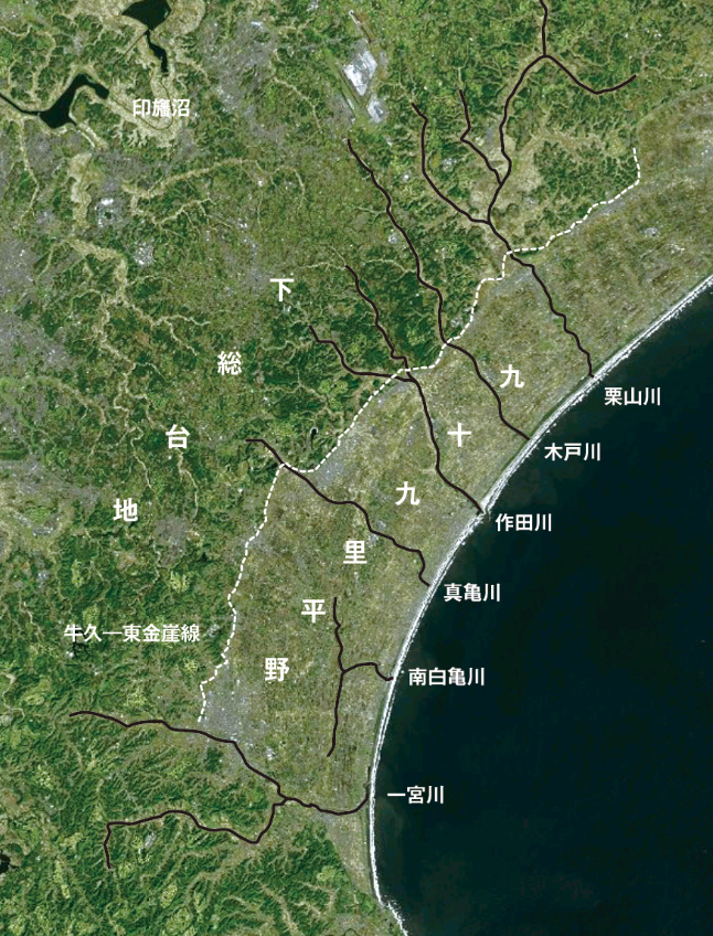 また、上総台地は東側が牛久―東金崖線で崖のようにえぐられたため、このあたりが分水界となった。つまり、この台地に降った雨は大半が北西の印旛沼方面へ流れていくのである。