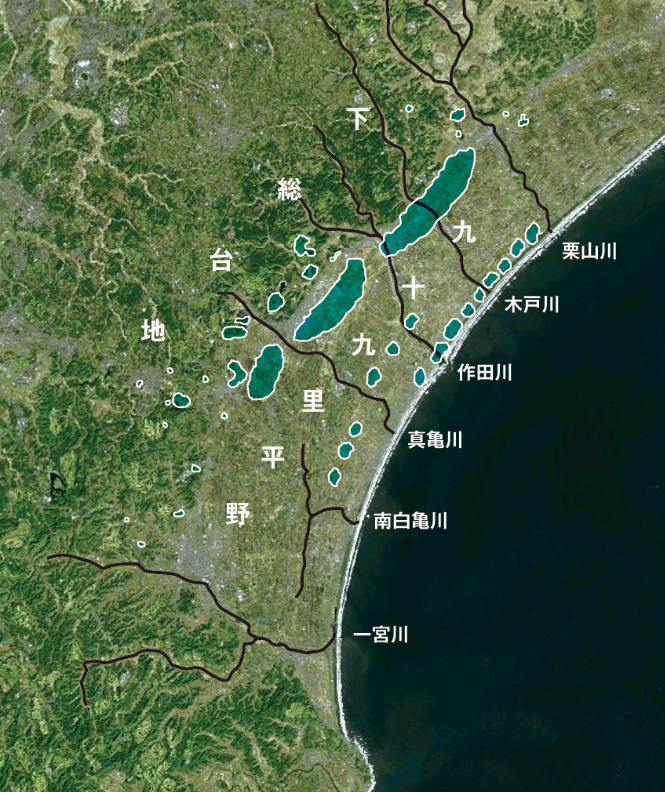 しかし、この海退は平坦な九十九里平野にとんでもない置き土産を残した。おびただしい数の潟湖である(図3)。潟湖とは、むかし海であった場所が海退や土地の隆起により、取り残された湖のこと。