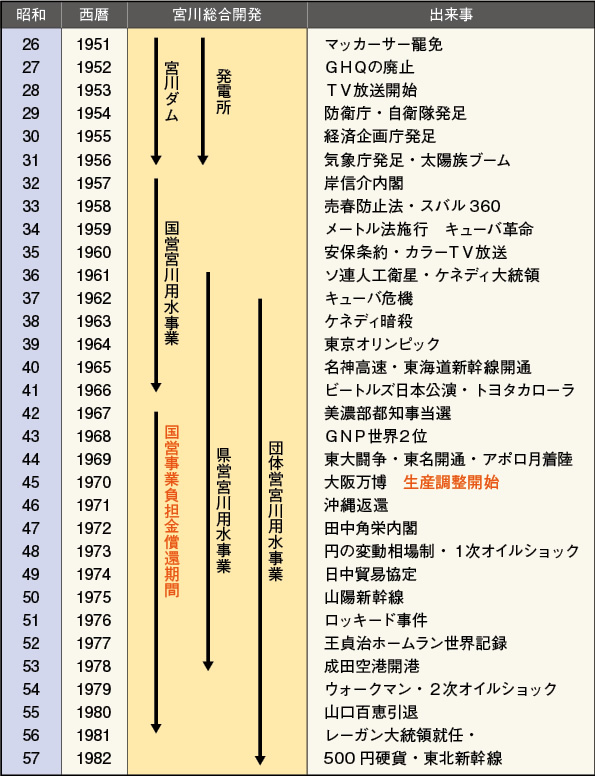 総合開発事業が着工されてから団体営事業が完了するまでに、実に30年の歳月を要している。宮川用水事業だけでも25年。この間の日本は敗戦の食糧難時代から世界の奇跡と言われた高度経済成長を果たし、世界の経済大国へと登りつめている。下の年表でその激しい時代の変化が確認できよう。